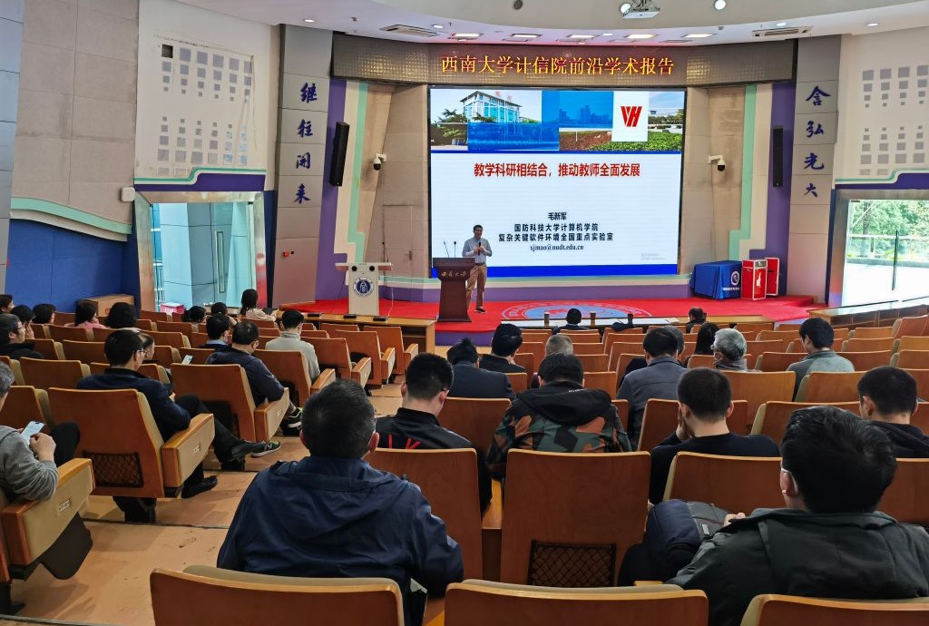 为深入贯彻落实科技是第一生产力、人才是第一资源、创新是第一动力,推进特色化示范性软件学院建设工作,强化教学科研人员立德树人、教书育人的初心使命,3月17日下午,我院举办前沿学术报告会。国防科技大学毛新军教授受邀担任报告嘉宾,报告会由副院长陈武教授主持,全院一百余名教学科研人员参会。