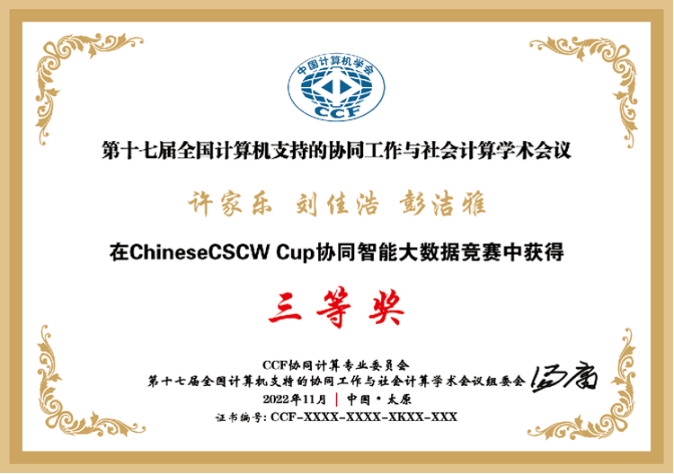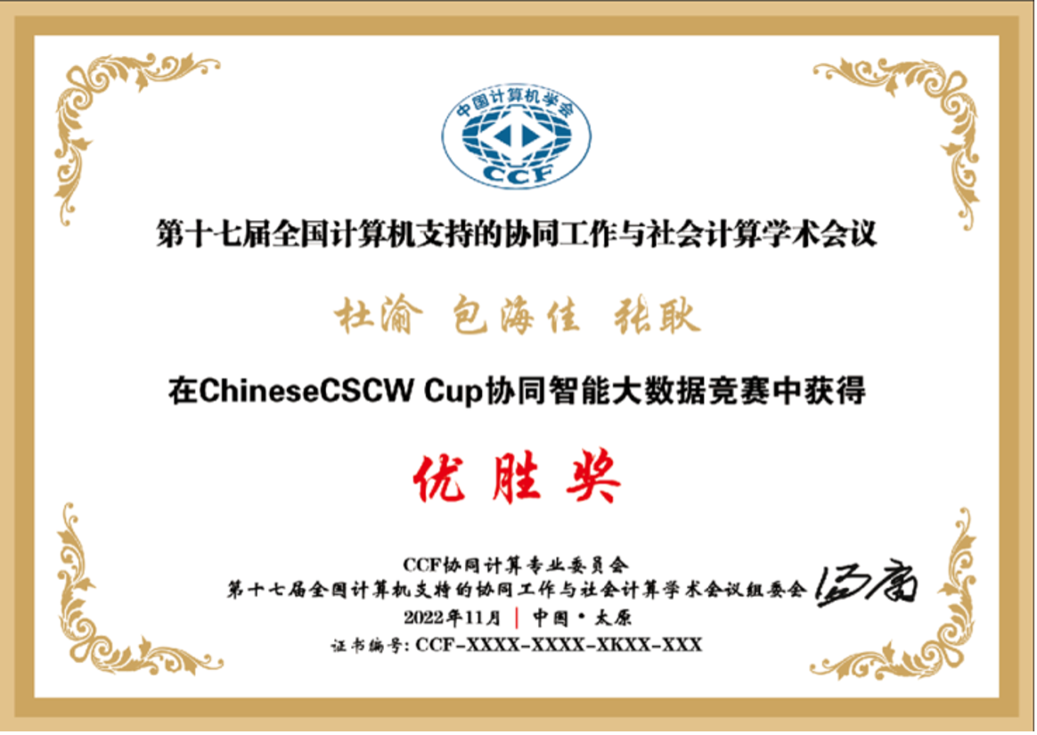 近日,由中国计算机学会(CCF)协同计算专委会组织的ChineseCSCW2022协同智能大数据竞赛在山西太原成功举办,我院“复杂系统与交叉科学应用”团队研究生组建的三支参赛队伍分别获得一等奖、三等奖和优胜奖。“复杂系统与交叉科学应用”团队已连续2年包揽此项比赛的一等奖(去年报道见http:/info/1040/1800.htm),展现了团队在社会计算领域的研究实力。