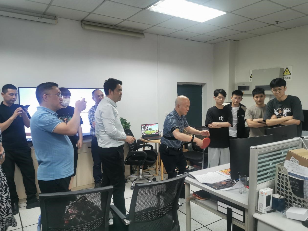 洽谈会后,黄承锋副校长一行参观了学院可穿戴与健康计算实验室,张衡教授介绍了目前实验室体感乒乓、智能感知节点、智能手表、情感计算、自主增强式健康模型等研究情况,并就如何解决健康问题做了深入探讨,大家分别体验了虚实环境中乒乓运动带来的快乐。