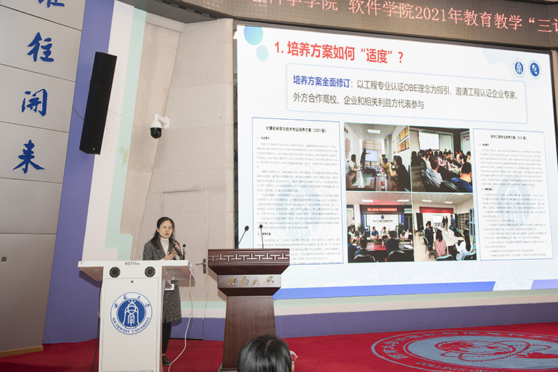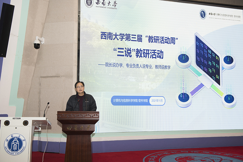 为全面贯彻党和国家的教育方针,深入贯彻新时代全国高等学校本科教育工作会议精神,坚持“以本为本”,全面建设高素质专业化创新型教师队伍,落实立德树人根本任务,落实“学生中心、产出导向、持续改进”的教育教学理念,提升教师教育教学水平,按照《best365英国体育在线一流本科教育建设实施方案》、《关于开展best365英国体育在线第三届“教研活动周”活动的通知》、《计算机与信息科学学院 软件学院第三届“教研活动周”实施计划》等文件要求,我院于2021年11月19日下午14:30,在25教1楼报告厅召开全体教职工大会,围绕“院长说办学、专业负责人说专业、教师说教学”的主题开展了教育教学“三说”活动。活动由学院分管教学副院长陶丽主持,学校本科教学督导组四位专家、院长肖国强及学院全体教职工参会。