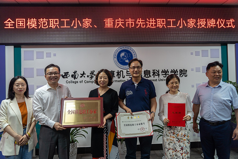 5月14日下午,重庆市教科文卫体工会常务副主席贺莉、副主席吴庆高一行为获得“全国模范职工小家”荣誉称号的计算机与信息科学学院”授牌。