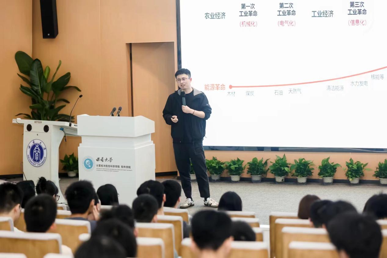 在正式的课堂讲授环节,华为重庆终端业务HRD樊勇首先向同学们介绍了华为的使命是致力于把数字世界带入每个人、每个家庭、每个组织,构建万物互联的智能世界。樊老师表示,作为全球信息与通信技术(ICT)解决方案的先行者,华为始终不遗余力地支持教育和人才培养。他向同学们回顾梳理了从农业经济到工业经济、数字经济、智能经济的社会发展历程和趋势,从数字经济基石、5.5G产业发展、绿色低碳产业转型、数字化人才的需求增长趋势等方面详细解析了ICT产业趋势,结合个人十余年的职场经历,向同学们详细讲解如何制定个人职业规划,包括确定职业目标、评估个人技能和兴趣、规划达成目标三个重要步骤,以及培养使命感、明确目标定位、升级思维、学习标杆、坚韧专注这五大成长秘籍。在随后的互动环节,樊老师热情回答同学们关于求职就业与未来发展方面的问题,详细解答同学们的疑惑。