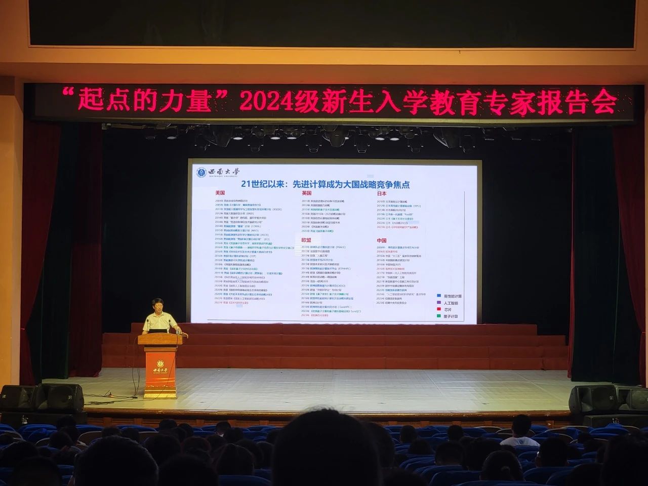 9月12日下午,学院张自力教授在光大礼堂为全体新生开展“新形势•新挑战•新思维”专题讲座。张自力老师以“Why your future is glorious?”这一振奋人心的提问拉开序幕,向2024级新生深入剖析了计算机、人工智能等高科技正在加速推动人类社会向智能化迈进的全新形势。张自力老师从当前世界百年未有之大变局的形势出发,为同学们分析了新形势下我们所面临的新挑战。他希望同学们锻造适应新时代需求“六大必备能力”:设计感、故事力、交感力、共情力、娱乐感、意义感,鼓励同学们追求有价值的成功。最后,张老师满怀激情地寄语新生:一是远离无谓的内卷,实现从自我迭代的“in•volution”向全面进化的“e•volution”转变;二是要坚持科技创新与人文素养并重,培养全面发展的自己,成为既有硬核科技实力,又具备深厚人文素养的新时代青年。