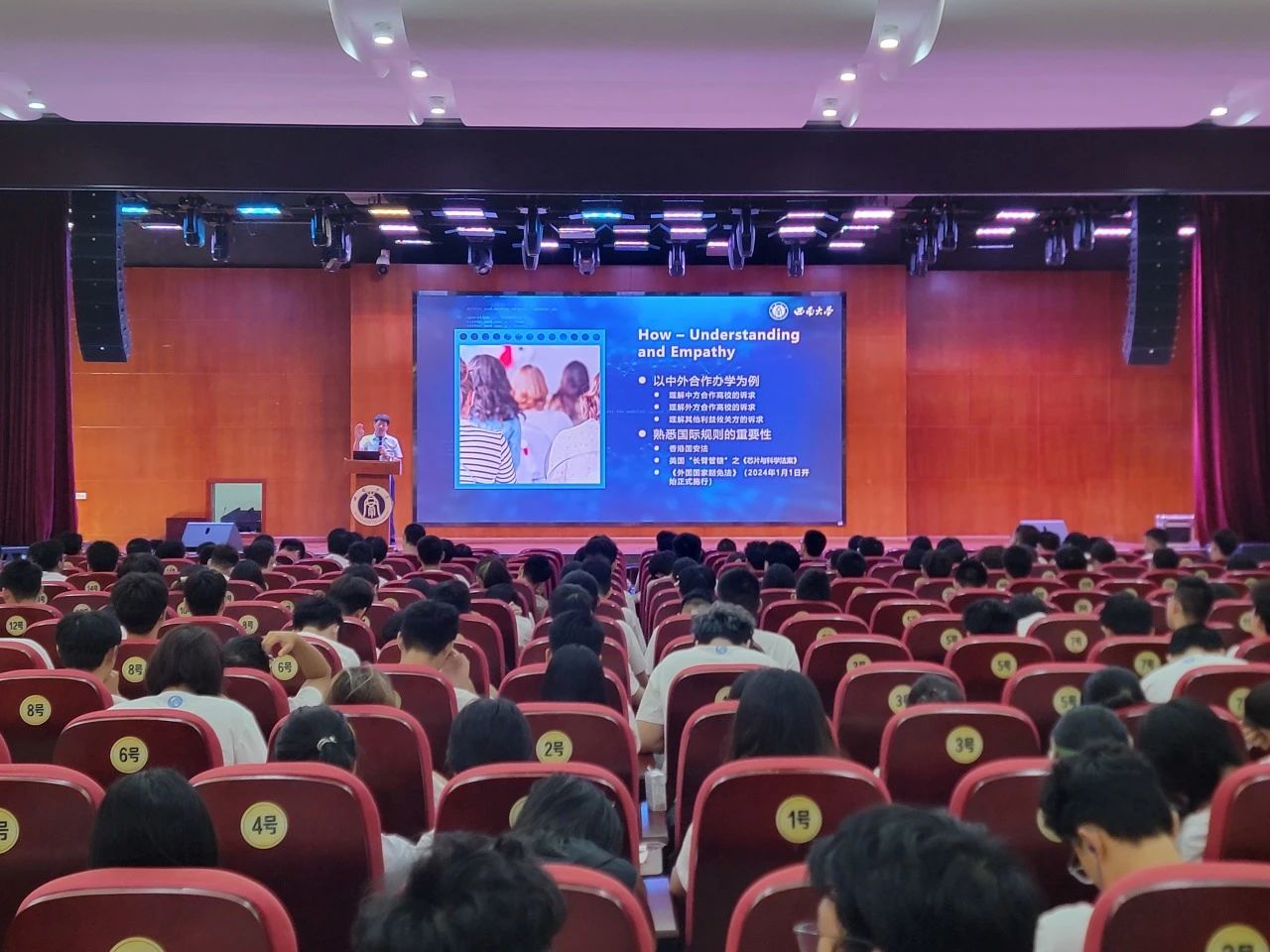 9月13日上午,张自力教授在学生处107报告厅为中外合作办学新生开展专题讲座“跨文化合作与中外合作办学”。张自力老师分享了学院近年来在中外合作办学领域取得的丰硕成果,生动展示了联合培养平台为学生搭建起通往世界的桥梁,让学术资源跨越国界,实现共享与融合的有效作用。张老师结合个人在国际合作办学领域的丰富经验和深刻洞察,鼓励学生们要敢于走出舒适区,积极拥抱多元文化,通过参与国际项目、交流访问等方式,拓宽视野,增长见识。他希望同学们充分利用国际化教育高地的独特资源与优势,勇于探索未知领域,敢于挑战自我,在跨文化交流中碰撞思想火花,汲取智慧养分。