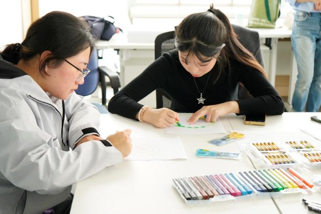 在小组共创环节,各小组成员们首先进行了自我介绍,然后在印有直径约20公分圆圈的A4纸上随性涂鸦,用各自独特的方式表达出内心想传递的情绪。在个人创作完成后,小组成员共同商讨,在纸上进一步围绕情绪圆圈绘制出内心的风景,最终共同完成了一系列充满创意与情感的作品。