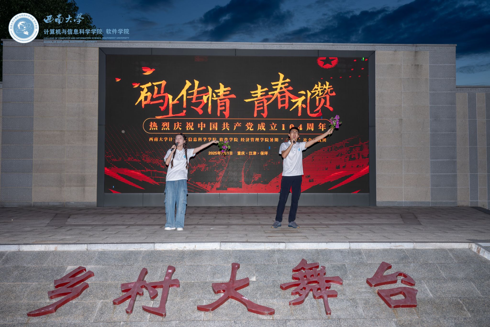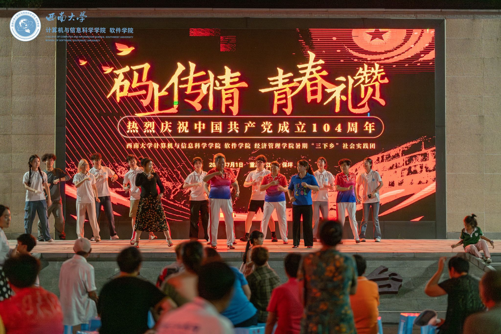 为庆祝党的生日,团队与村民共同策划了“码上传情,青春礼赞”主题文艺晚会。晚会节目形式多样,精彩纷呈:大合唱激昂澎湃,方言三句半诙谐幽默,悠悠球表演灵动酷炫,防诈情景剧寓教于乐。当地舞蹈队的奶奶们身着彩衣,用曼妙舞姿为晚会增添了浓郁的乡土气息。从前期筹备到现场演出,团队成员与村民紧密协作,在欢声笑语中共庆党的华诞,展现了青春与乡村的激情碰撞。