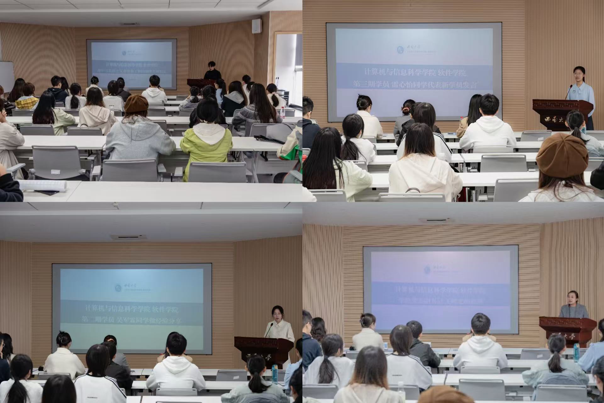 仪式在庄严的国歌声中拉开帷幕。第二期“青马工程”学员代表吴军霖同学作经验分享。她结合自身在青马工程中的学习与实践经历,回顾了在理论课堂中深入研读经典、在实践熔炉中锤炼担当的成长过程,并鼓励新学员保持求知热情、坚守初心纯粹、常怀团结意识,真正将个人理想融入民族复兴伟业。接着,第三期“青马工程”学员代表雷心怡同学发言。她代表全体新学员承诺:在深学细悟中铸牢“青春向党”的忠诚信仰;在知行合一中展现“强国有我”的实干担当;在先锋引领中彰显“计信青年”的昂扬风貌。