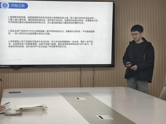 学院2024级计科中外专业优秀学生代表喻子洋,自动化专业优秀学生代表王奇凯、范逸贤,软工普通专业优秀学生代表豆柯锐在25教1320会议室,为大一年级同学们带来《高等数学IA》和《线性代数》课程期末复习备考建议与规划。在《高等数学》课堂上,喻子洋同学对教材知识点进行了全面且细致的梳理,构建起完整的知识框架。每个模块复习结束后,他精心挑选典型例题,带领同学们进行实战演练,强化对知识点的理解与运用。自动化专业优秀学生代表王奇凯同学聚焦定积分与极限存在问题两大核心考点,深入剖析公式、法则使用过程中的易错点,分享“大胆假设,小心求解”的解题心态与技巧,并开通交流渠道,为同学们提供课后指导。