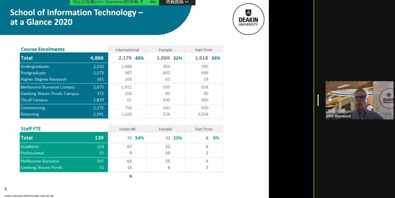 随后迪肯大学信息技术学院院长约翰·雅伍德教授为大家详细介绍迪肯大学和信息技术学院,详细讲解了针对中外合作办学学生的各类优惠政策,并为学生们展示优美的城市环境、迪肯大学美丽的校园环境以及先进的设施。