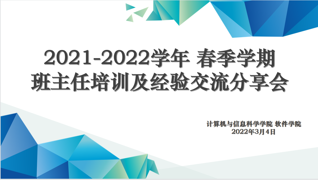 为深入学习贯彻习近平总书记对教育工作重要指示精神,落实好立德树人根本任务,形塑学院”三全育人”工作格局,大力推进学院学风建设,3月4日,计算机与信息科学学院 软件学院举行了2021-2022学年春季学期 班主任培训暨经验交流分享会。学院党委书记、副书记、全体班主任及辅导员老师参加了本次活动。