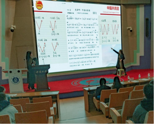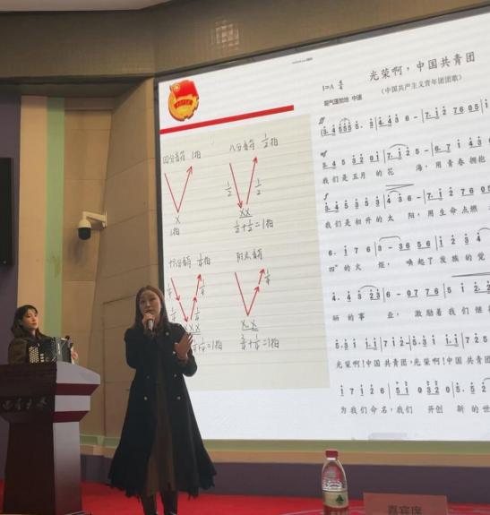 随后,宣讲团成员们用专业的音乐知识教唱团歌《光荣啊,中国共青团》,热情歌颂中华民族源远流长的光荣历史和中国人民坚强不屈的斗争精神。讲座氛围热烈,在场同学热情高涨。