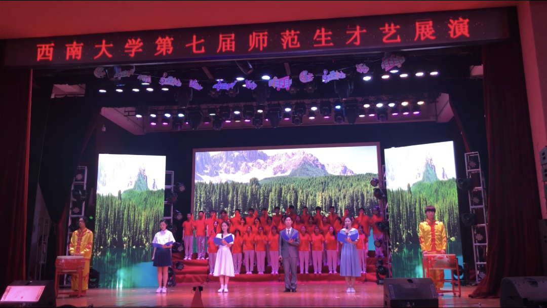该节目由我院师范生自导自演,学院几十位师范生身穿红色礼服,深情朗诵、歌唱,表达了少年壮志将不畏逆流阻隔,直击高远苍穹的情怀。
