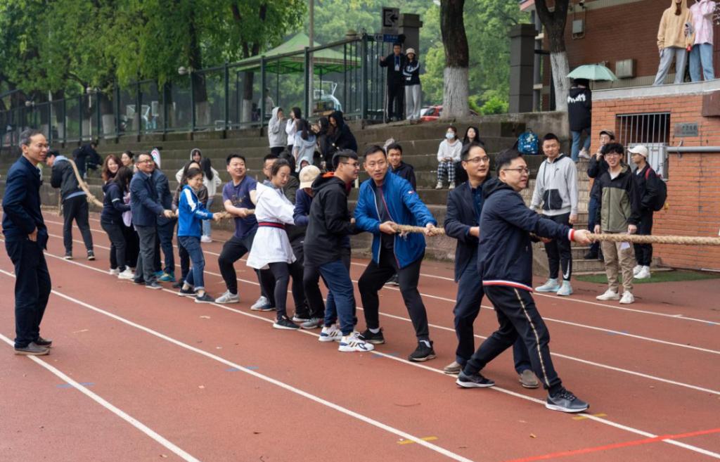 简短的开幕式结束后,各项比赛项目随之展开。“师生拔河赛”,教工队和学生队精神抖擞、蓄势待发,“加油!加油!”,在现场观众一声声加油助威的声浪中掀起了第一个高潮。比赛双方奋力向后拉着绳子。最终,经过双方激烈的比拼,教工队伍取得了胜利。