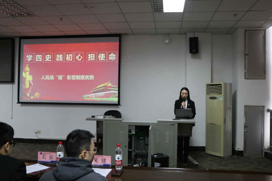 在第四讲中,党员吴欣俣同学讲述微党课——《人民战“疫”彰显制度优势》,她从"决策果断","全民动员","举国攻坚"三个方面再结合抗击疫情宣传片讲述了党带领全国各族人民团结一心,进行了一场惊心动魄的抗疫大战,付出巨大努力,取得抗击新冠肺炎疫情斗争重大战略成果,创造了人类同疾病斗争史上又一个英勇壮举!在面对突如其来的严重疫情,中国人民风雨同舟、众志成城,构筑起疫情防控的坚固防线。