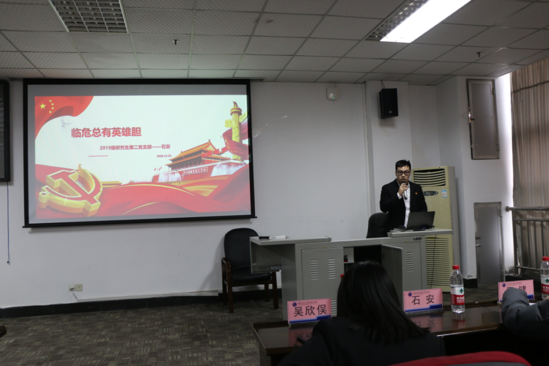 来自2019级研究生第二党支部的石安同学讲述的主题为——《临危总有英雄胆》。石安同学通过短片向同学们讲述了“尊重科学”的求真情怀,希望我们相信科学,尊重科学以及拥有“命运与共“的天下情怀,还强调了人类命运共同体的重要性,特别是在全球阻击疫情中尤其凸显人类命运共同体理念的时代价值。