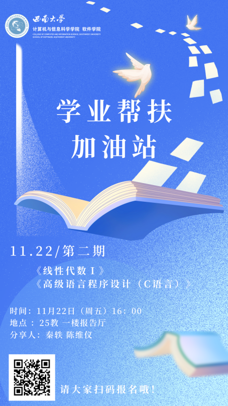 2024年11月22日,2024秋季学期第二期“学业帮扶加油站”在25教一楼报告厅顺利开展。本期活动针对《线性代数I》和《高等语言程序设计(C语言)》两门课程进行学习内容分享与重点知识讲解。助力学院学子夯实专业基础,激发学习潜能,提升学业成绩。