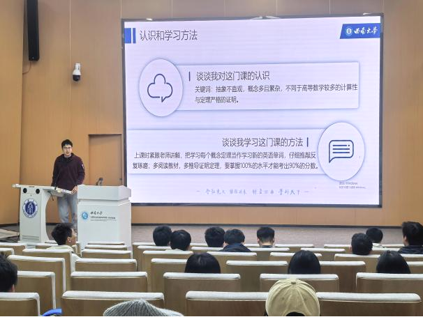 《线性代数I》由2023级秦轶同学作为主讲人。他坦言初涉线性代数普遍会感到迷茫与挑战。随后他分享了如何调整学习策略,将复杂抽象的概念学习类比为词汇积累,强调深入理解与反复推敲的重要性。在日常学习中,他建议同学们紧跟教师步伐,对模糊概念回归教材进行验证,确保掌握每个定理的内在逻辑。面对期末复习,秦轶鼓励同学们:“唯有达到100%的掌握程度,方能考出90%的佳绩。”倡导同学们在复习的过程中主动梳理疑难点,明确重点与非重点知识,做到心中有数,有的放矢。最后,秦轶同学分享了其精心梳理的学习笔记,对每一章节的重点知识与难点概念做了深刻的提炼与总结,为同学们树立了学习典范,提供了具有借鉴意义的学习范本。