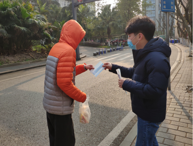 有同学刚在食堂打包好晚餐,正在回寝室的路上。收到党支部同志送上的口罩后,他表示十分感谢,并说明自己是一时疏忽,以后一定注意做好防范措施。