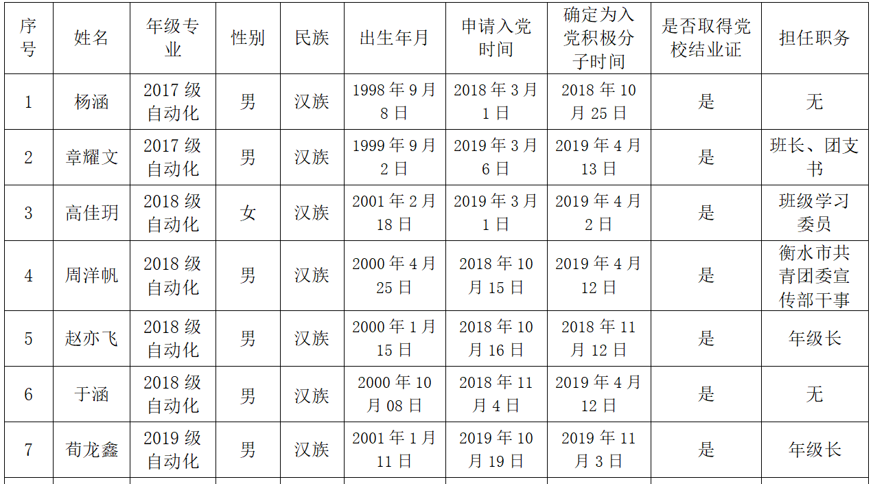 经学院自动化专业本科党支部培养考察,在听取培养联系人、党员和群众意见的基础上,经党支部讨论,确定杨涵等8名同志为发展对象。现根据学校发展对象备案制度进行公示,公示期为2021年4月21日-25日。如有意见,请在公示期内当面或通过书信、电话、电子邮件等方式实名反映。