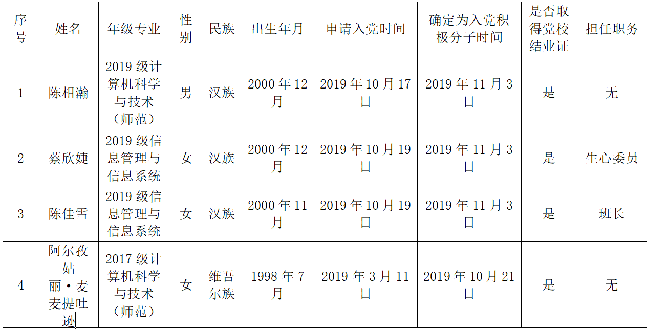 计算机与信息科学学院党委计算机科学与技术(师范)一党支部关于确定陈相瀚等7名同志为发展对象的公示