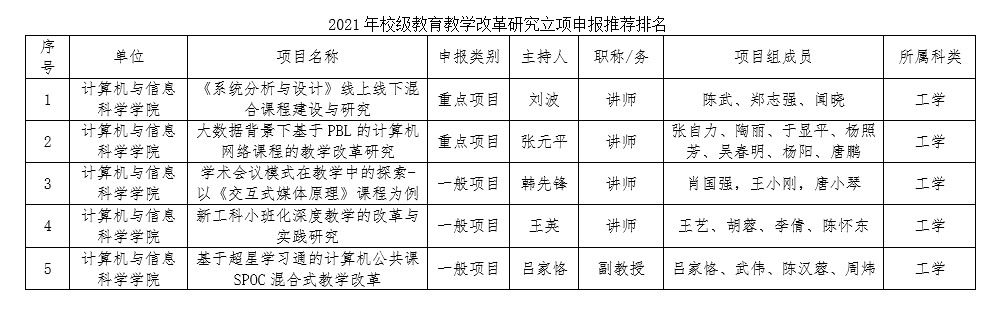 根据《best365英国体育在线教育教学改革研究项目管理办法》(西校〔2019〕95号)和教务处《关于组织开展2021年校级教改项目立项申报工作的通知》,经个人申报,学院学术委员会委员评审推荐,现对我院申报2021年校级教改项目的推荐排名结果进行公示。公示期(3个工作日):2021年6月29日-2021年7 月1日。公示期内如有异议,请于公示期截至当日17:30前以书面形式实名反映,受理联系人:刘作勋,受理电话:68254254。