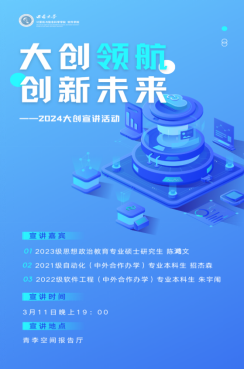 3月11日19:00,计算机与信息科学学院 软件学院在团委青李空间报告厅举行以“大创领航,创新未来”为主题的大学生创新创业项目宣讲活动。活动由团委学生会学习科技部张天骋同学主持,实习辅导员马潇潇、2022级与2023级同学代表参加活动。学习科技部张天骋同学从项目简介、申报流程、项目风采和选题范围四个方面对大创进...