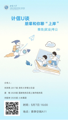 为培养同学们生涯规划意识,帮助同学们及早确定目标与落实行动,5月7日下午四点,学院在青李空间开展“计信U谈:朋辈与你聊上岸”主题分享活动。学院党委副书记王晖老师、团委书记杨靖欣老师、2017级校友刘泽夷同学、2020级自动化专业姜畅同学,2020级软件工程刘振坤同学以及30余名同学代表参加本次活动。活动初始,王...