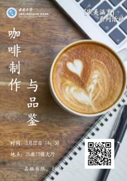 咖啡与茶、可可共称为世界三大饮品。闲暇时,一杯咖啡可以品出人生百味;繁忙时,一杯咖啡可以喝出现代人的节奏和情感。3月22日下午14点,“审美涵育”系列活动之“咖啡制作与品鉴”在25教13楼大厅举行,本次活动特邀资深咖啡师詹奥担任主讲老师,学院党委副书记王晖、团委书记杨靖欣以及各年级学生代表参加本次活动。活...