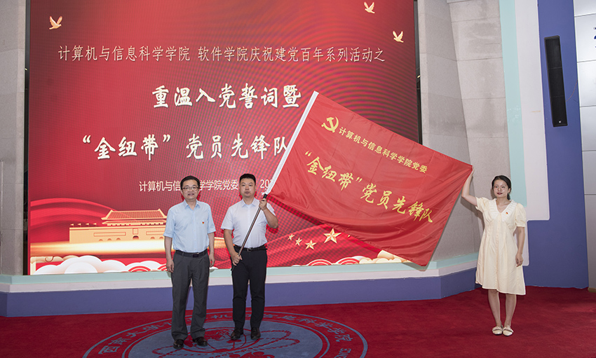 ——学院举办重温入党誓词暨“金纽带”党员先锋队成立仪式为庆祝中国共产党成立100周年,推动党史学习教育落到实处,6月23日,计算机与信息科学学院隆重举行重温入党誓词暨“金纽带”党员先锋队成立仪式。学院两委委...