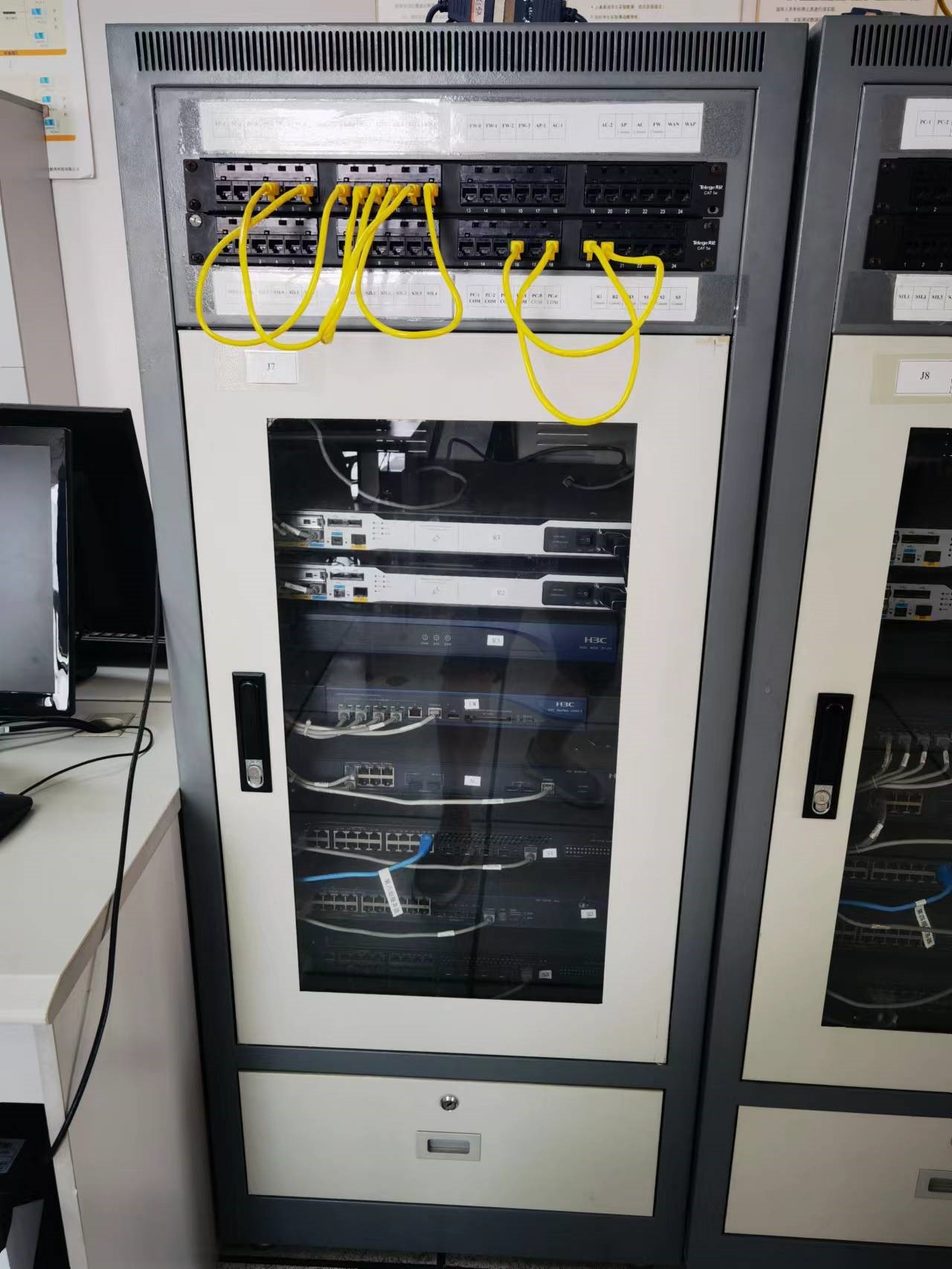 该实验室共设置10个机柜,每个机柜配置路由器(H3C MSR 35-20)2台、路由器(H3C MSR 20-20)1台、三层交换机(H3C S5130)1台、二层交换机(H3C E1268)2台、终端控制器AC(H3C WX3010E)1台、终端接入设备AP1台、防火墙(H3C FW SecPath U200-S)1台。每个机柜配备6个计算机终端,实验室可容纳60名学生同时进行网络实验。
